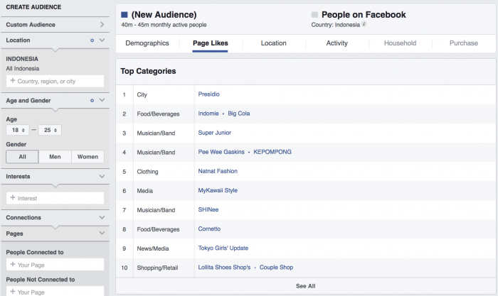 AI akan menyajikan kepada kita detail halaman-halaman Facebook yang disukai oleh target kita (orang Indonesia, usia 18-25 tahun), kategori teratas (top categories) yang muncul, seperti kota, makanan kesukaan, website, pakaian, brand-brand populer, dsb.