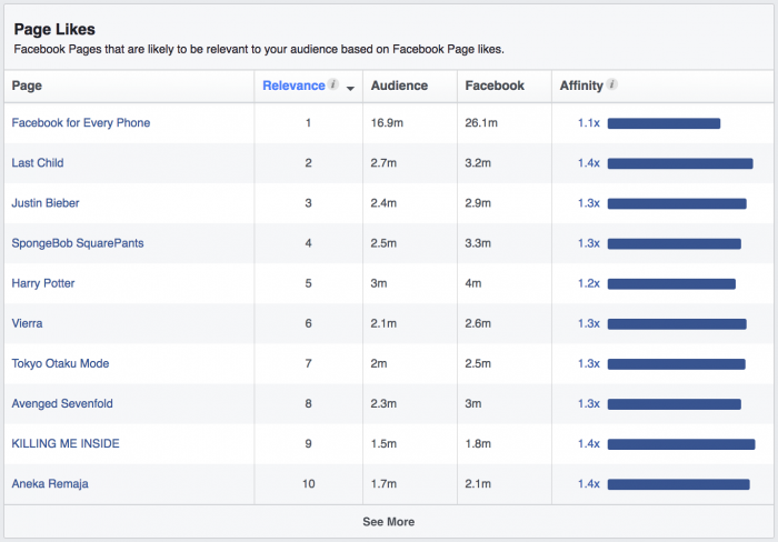 Jika Anda melihat di bagian “Page Likes”, Anda akan menemui tabel yang berisi halaman yang disukai oleh audience pada pengaturan yang Anda buat. Nah, pada kolom ketiga Anda akan melihat kolom Audience. Apa artinya? Audience number adalah jumlah audience dalam pengaturan yang Anda buat, yang terlibat dalam halaman tersebut.