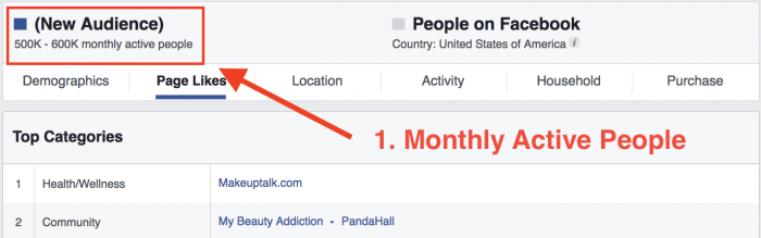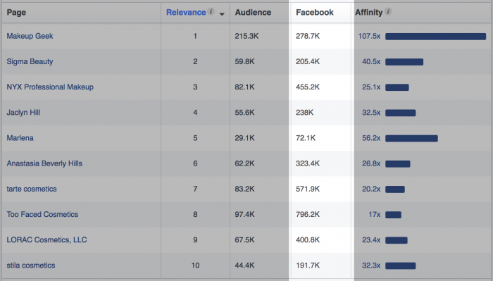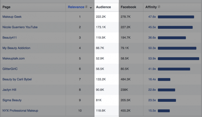 Misal, pada baris pertama Anda lihat halaman Makeup Geek, berisi 222,200 orang. Artinya, dari pengaturan yang Anda buat (warga US, usia 18-65, menyukai hal seputar makeup), terdapat 222,200 orang juga menyukai Makeup Geek.
