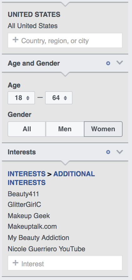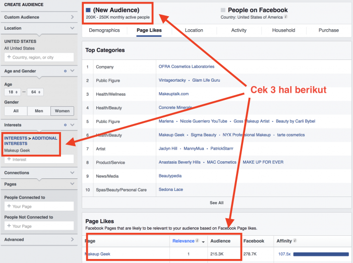 Anda akan menemui bahwa sebagian besar audience page tersebut akan sama dengan angka MAP, angkanya mirip-mirip. Pada contoh diatas, angka MAP 200k, angka audience 215k. Artinya jika kita menargetkan interest Makeup Geek, maka 99% audience-nya adalah orang yang berinteraksi di page Makeup Geek.