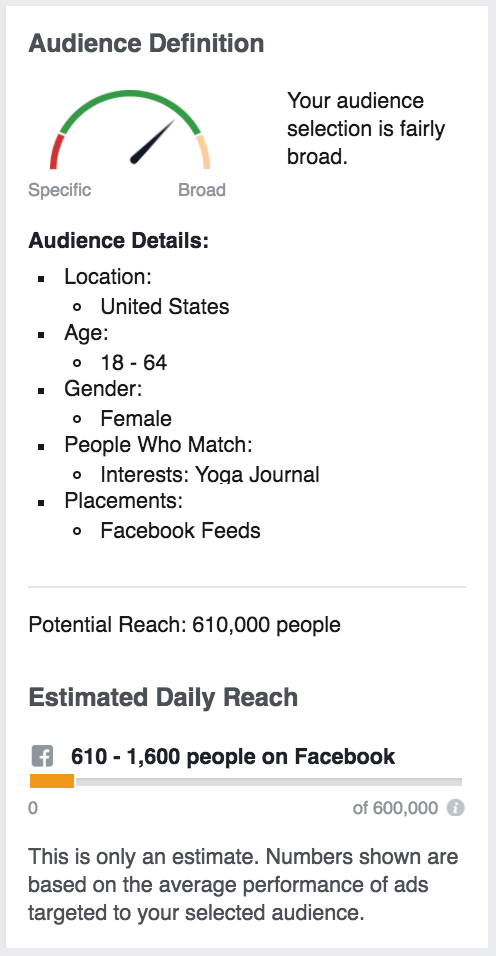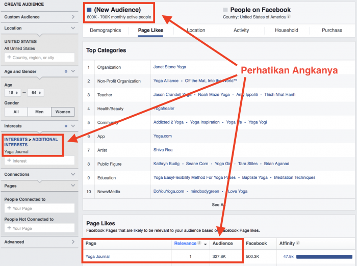 Artinya memang benar-benar volume audience dari 1 interest Yoga Journal adalah 600.000 orang. Artinya terdapat orang-orang yang belum pernah sama sekali berinteraksi di page Yoga Journal, namun dikategorikan oleh Facebook sebagai audience yang termasuk dalam Yoga Journal. Nah siapa orang-orang ini?